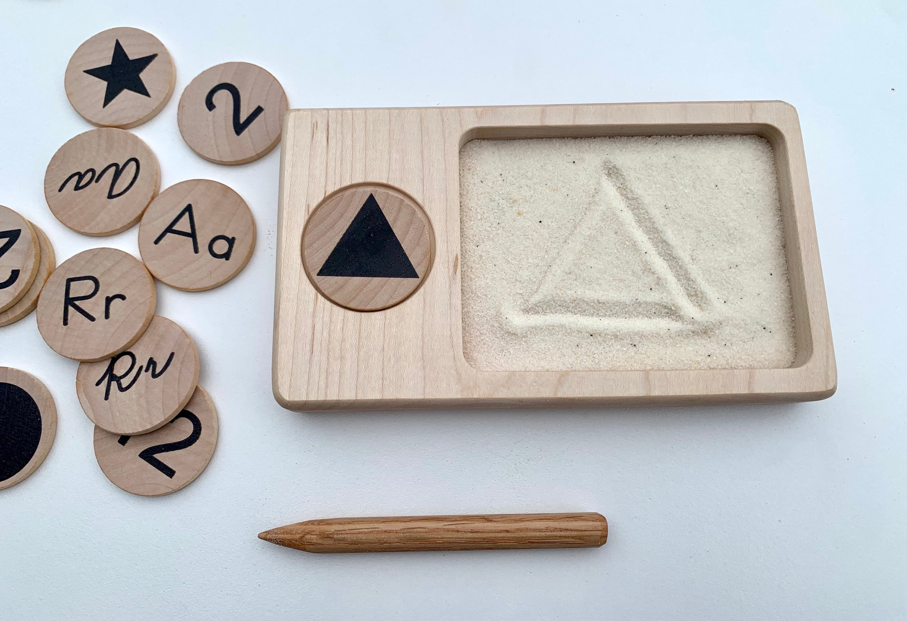 It can be used as a writing practice tray, sand can be put in the tray, and use number tokens, letter tokens (available in print and script with upper and lower cases) or shapes, in the token slot. Then use the included stylus to practice writing the displayed character.