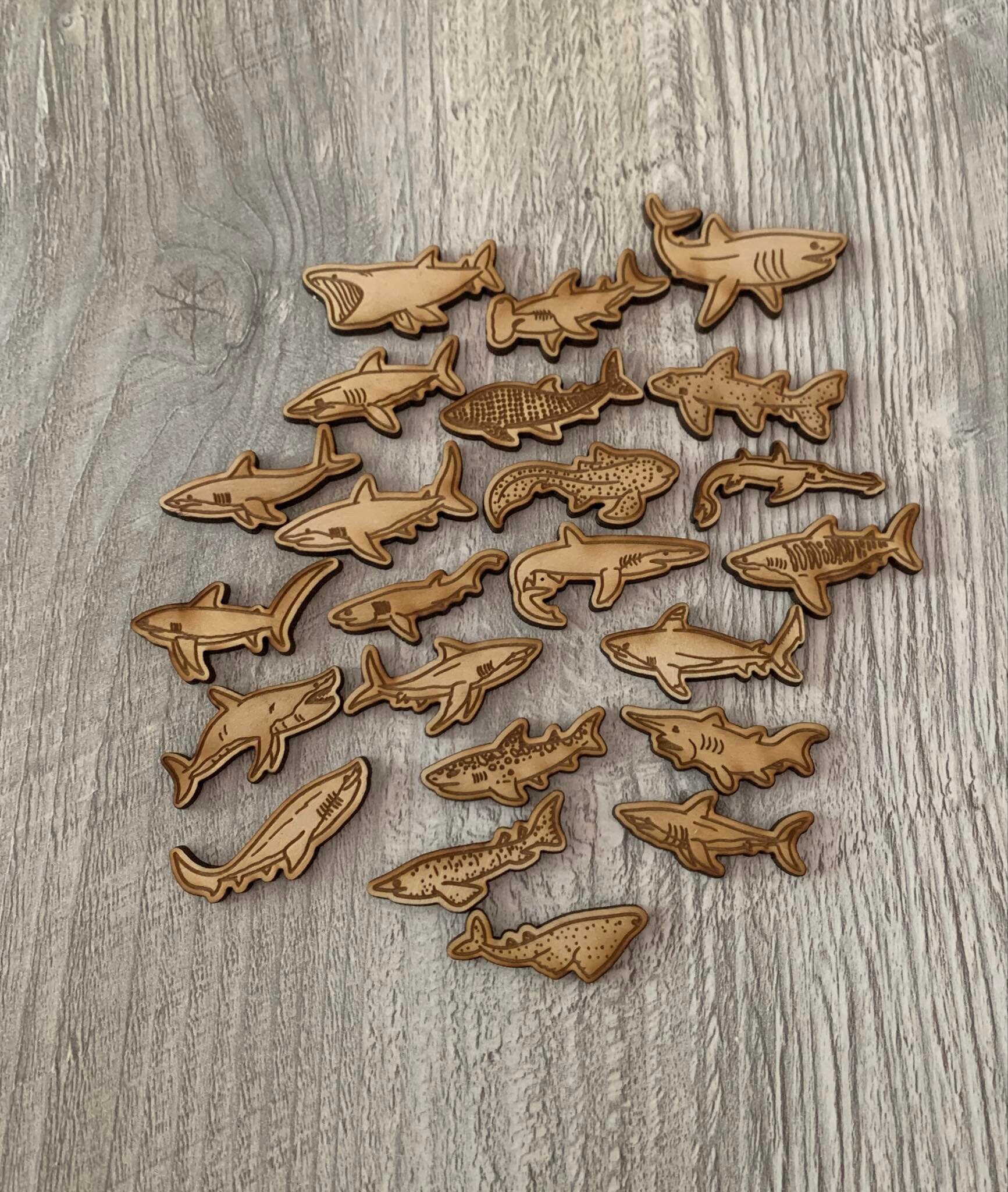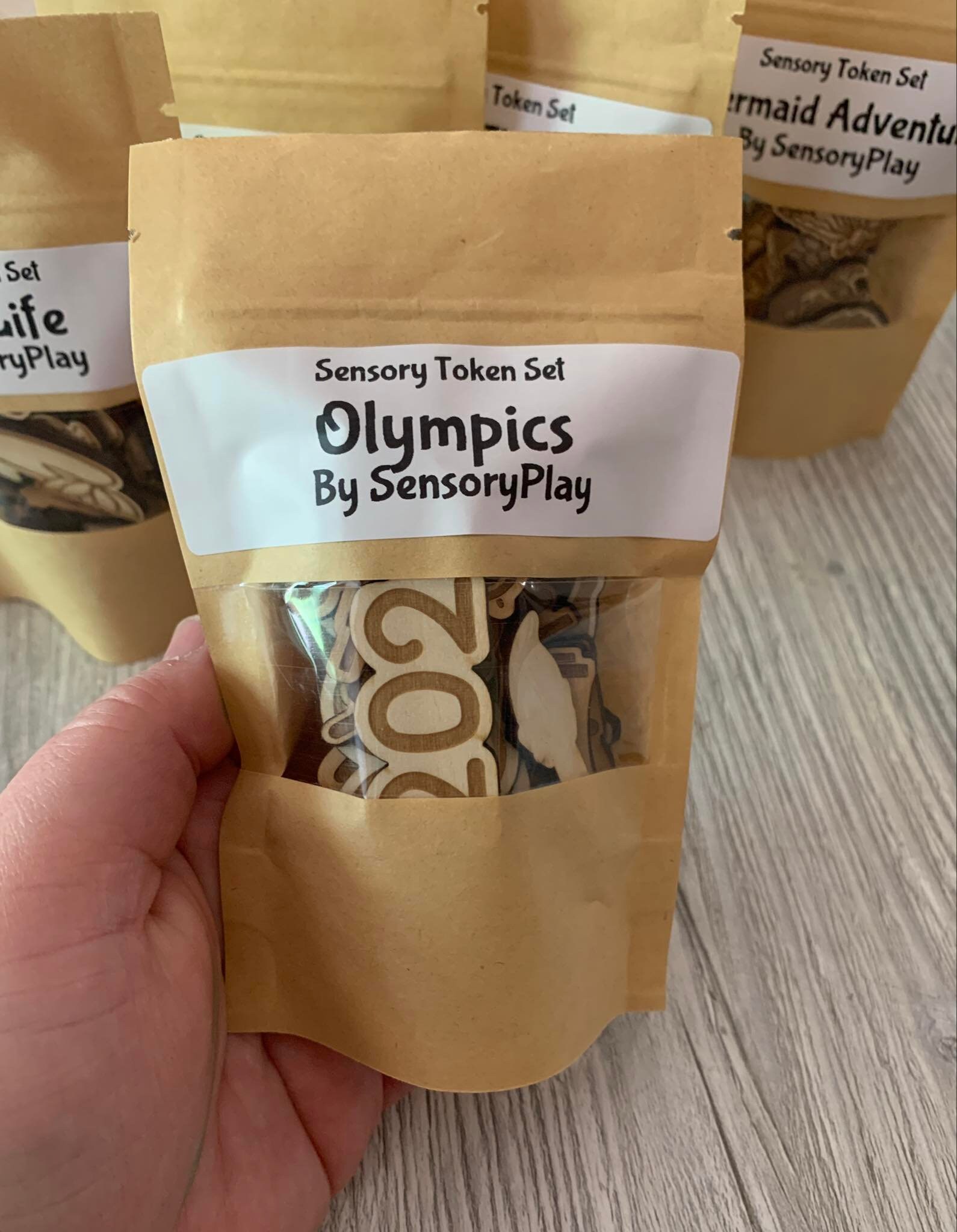 wooden sensory token sets, olympics activity, pond life counters, under the sea adventure set, wooden shark cutouts, sensory play set