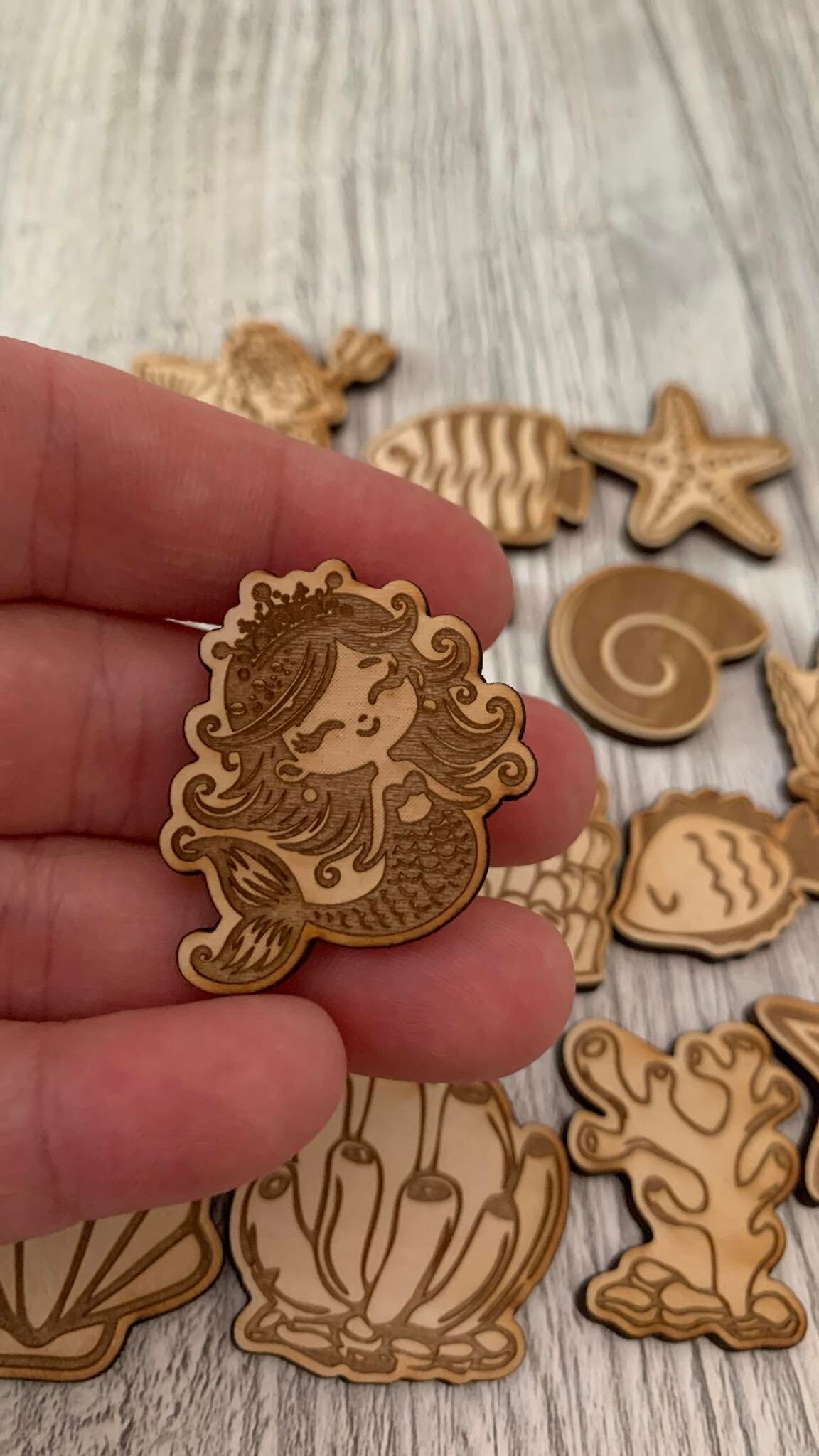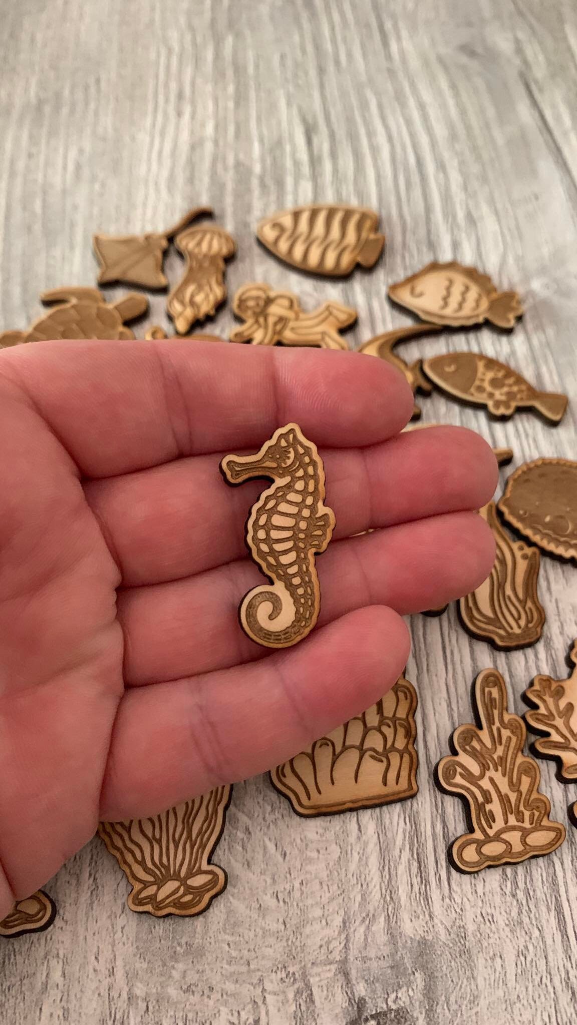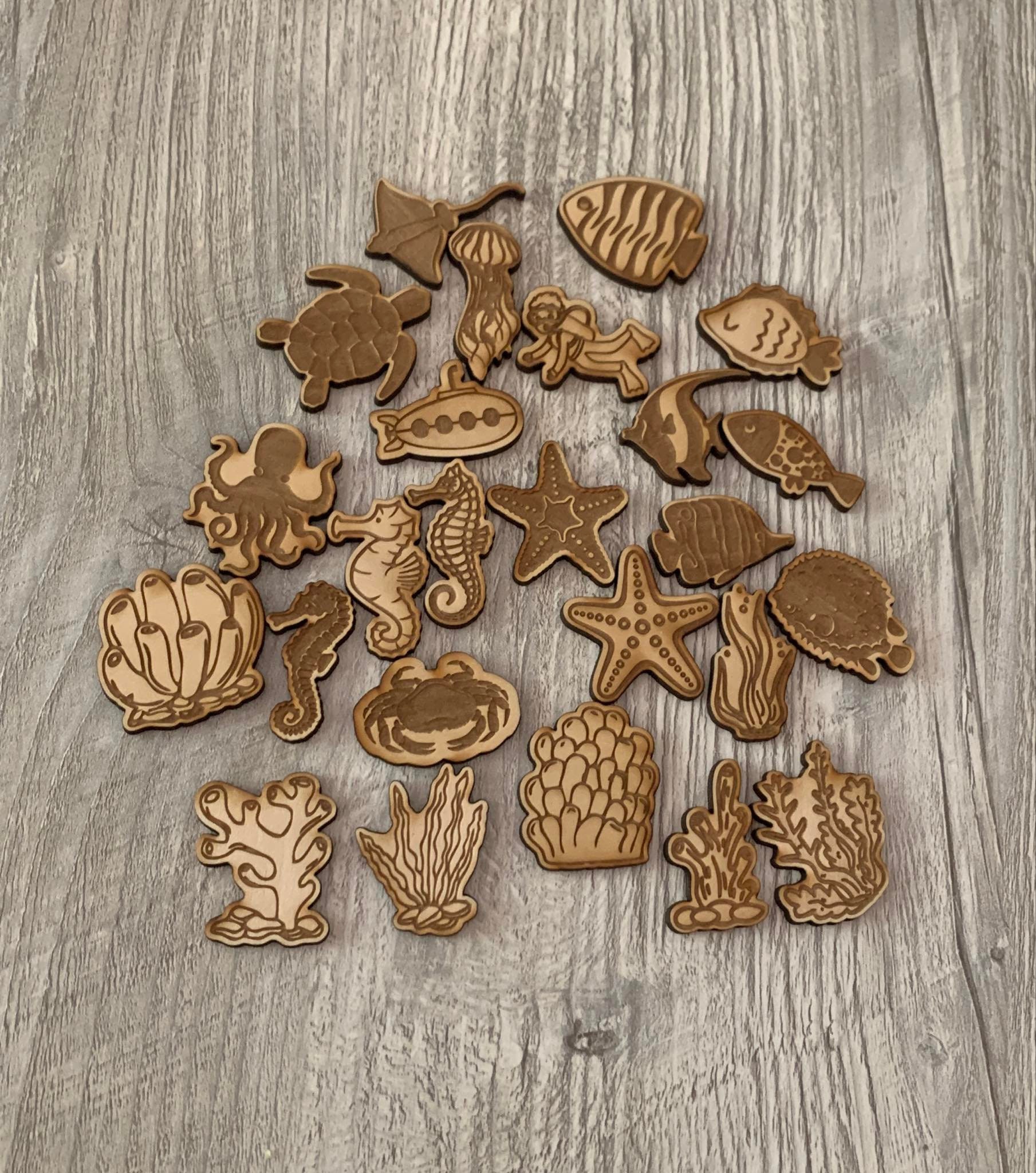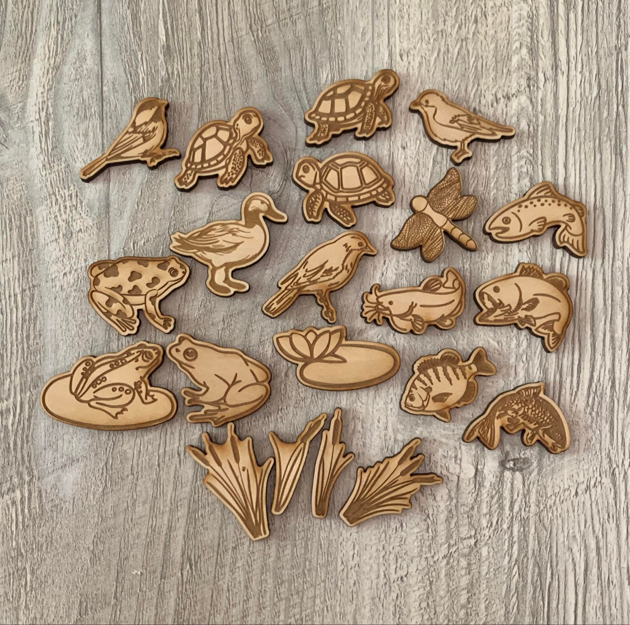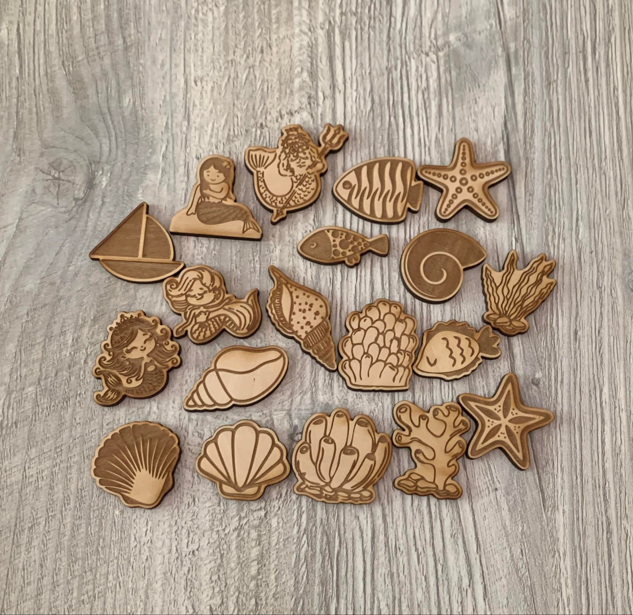 These wooden sensory play sets are wooden tokens that can be added to a sensory bin or sensory filler to bring even more excitement. Play eye spy or go on a treasure hunt. Tell a story about the fishes and the frogs at the pond. Have a naming contest for the mermaids. Sort the trash from the recycling! Your little will have hours of extra fun with these sensory enhancement!